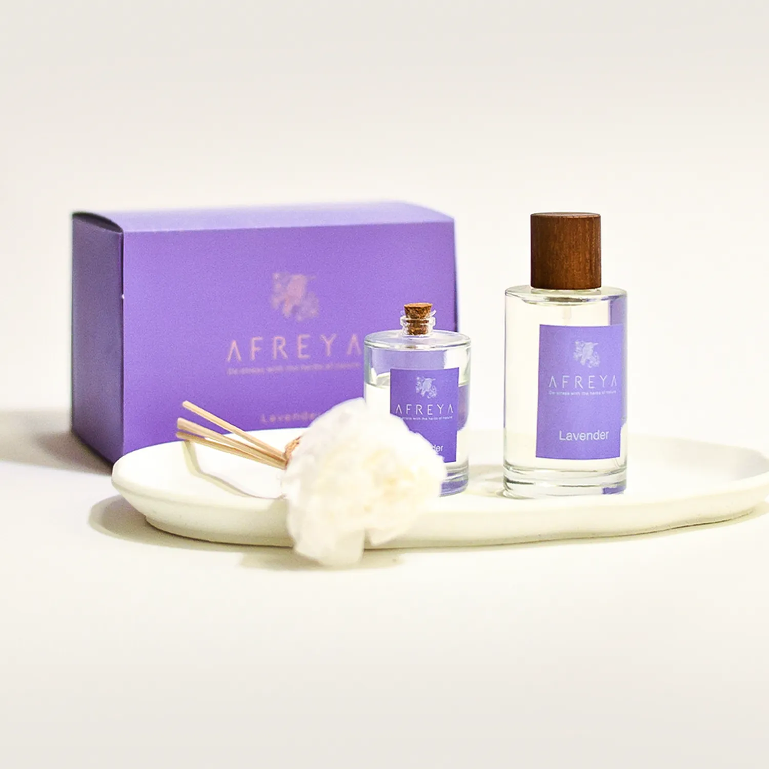Redolence and Reed Diffuser Set is a premium fragrance collection designed to fill your space with a refined and long-lasting aroma. Includes Redolence, Reed Diffuser, and Concrete Tray for a complete luxury presentation. Available in Rose, Jasmine, and Lavender variations, perfect for home or office use.